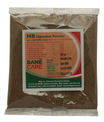 H8 Churna is digestive and carminative anti spasmodic. it improves salivary secretion, improves quality of gastric juices, improves gastric emptying, It improves liver function and metabolism.